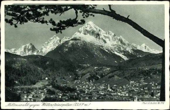 Ak Mittenwald in Oberbayern, Gesamtansicht mit Wettersteinspitze