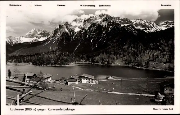 Ak Mittenwald in Oberbayern, Lautersee gegen Karwendelgebirge