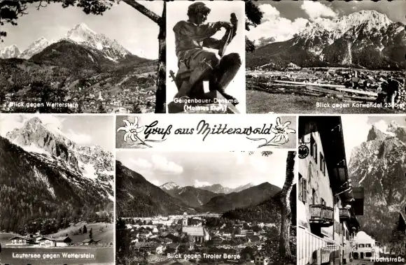 Ak Mittenwald in Oberbayern, Panorama, Hochstraße, Lautersee, Geigenbauer-Denkmal