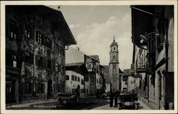 Ak Mittenwald in Oberbayern, Straßenpartie, Kirche