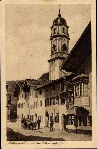 Ak Mittenwald in Oberbayern, Straßenpartie, Kirchturm