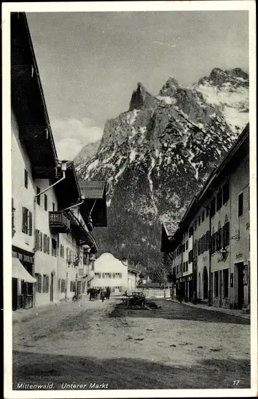 Ak Mittenwald in Oberbayern, Unterer Markt, Berge