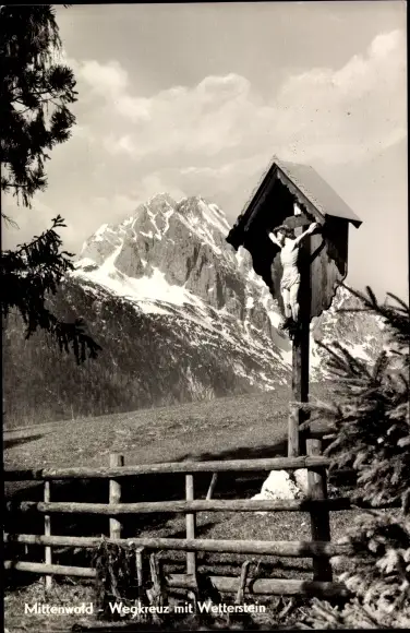 Ak Mittenwald in Oberbayern, Wegkreuz, Wetterstein
