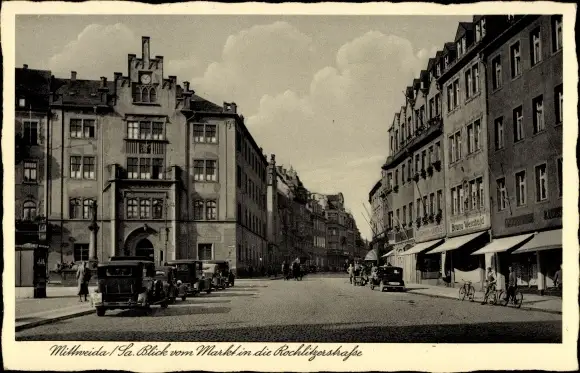 Ak Mittweida in Sachsen, Blick vom Markt in die Rochlitzer Straße, Autos, Geschäfte