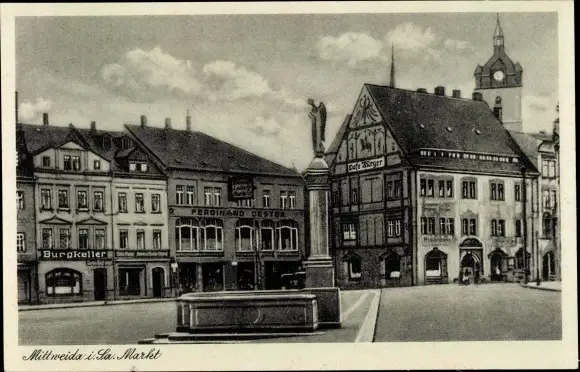 Ak Mittweida in Sachsen, Markt, Burgkeller, Cafe, Geschäfte, Brunnen