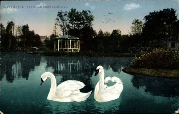 Ak Mittweida in Sachsen, Partie am Schwanenteich, Pavillon, Schwäne