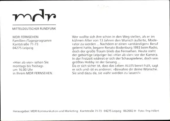 Ak Moderator Renato Bodenburg, Portrait, Sendung Hier ab vier, Autogramm