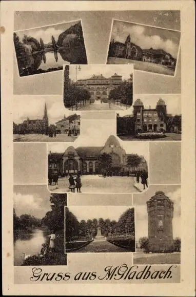 Ak Mönchengladbach am Niederrhein, See, Turm, Bahnhof, Kirche, Straßenpartie