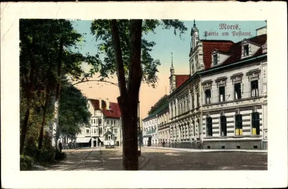 Ak Moers, Partie am Postamt, Straßenbahn, Gleise, Häuserfassade