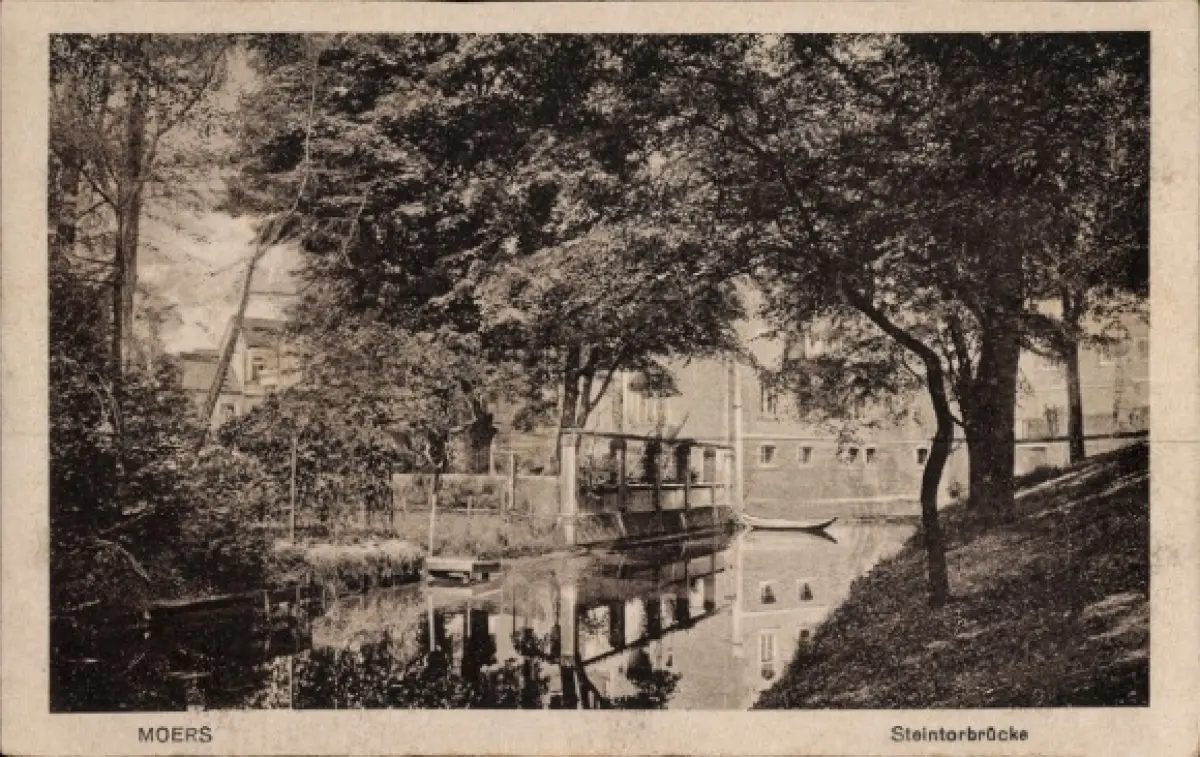 Ak Moers am Niederrhein, Steintorbrücke, Wasser, Bäume, Boot