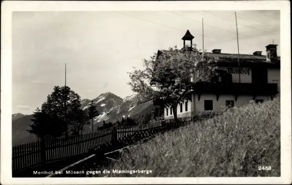 Ak Mösern Telfs in Tirol, Menthof gegen die Miemingerberge