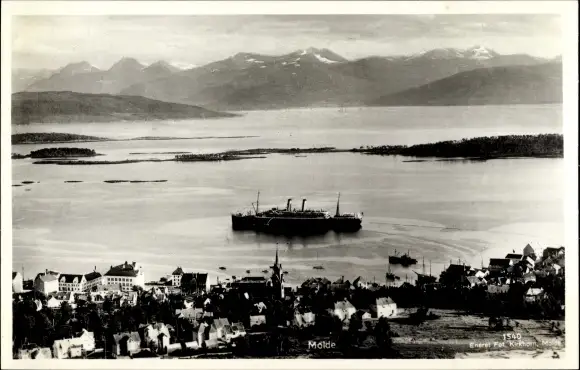 Ak Molde Norwegen, Totalansicht, Ortschaft, Dampfer im Hafen