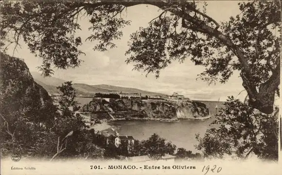 Ak Monaco, Schöne Küstenlandschaft, Olivenbäume, Gebäude