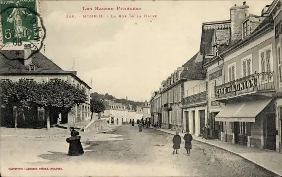 Ak Monein Pyrénées Atlantiques, Straße in Architektur, Personen