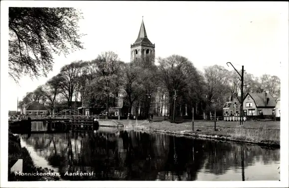 Ak Monnikendam Waterland Nordholland Niederlande, Flusspartie, Kirchturm, Aankomst