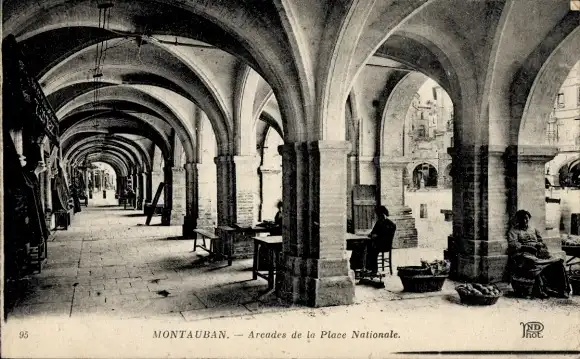 Ak Montauban Tarn et Garonne, Arcades de la Place Nationale