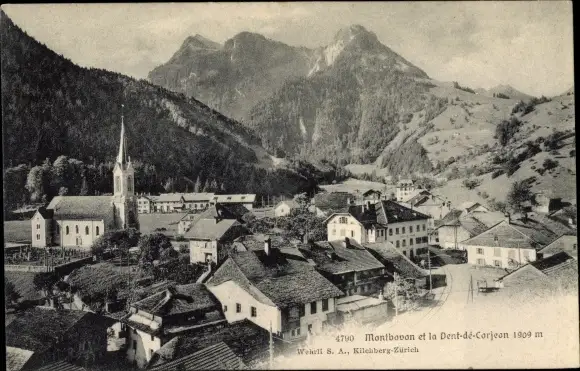 Ak Montbovon Kt. Freiburg Schweiz, et la Dent-de-Corjeon, Kirche, Ortschaft, Bergspitze