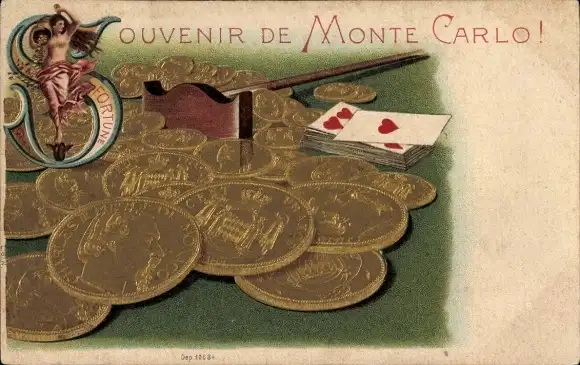 Ak Monte Carlo Monaco, Vintage Postkarte, Münzen, Spielkarten, Glückssymbol