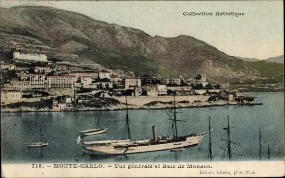 Ak Monte Carlo Monaco, Vue generale, Baie de Monaco, Segelschiff