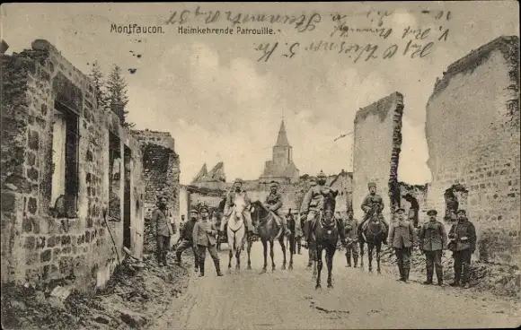 Ak Montfaucon Meuse, heimkehrende Patrouille, Kriegsschauplatz 1. WK