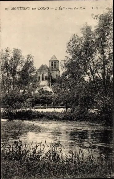 Ak Montigny sur Loing Seine et Marne, L'Eglise vue des Pres