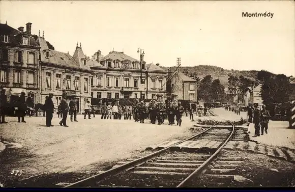 Ak Montmédy Lothringen Meuse, Stadtansicht, Passanten, Gleise