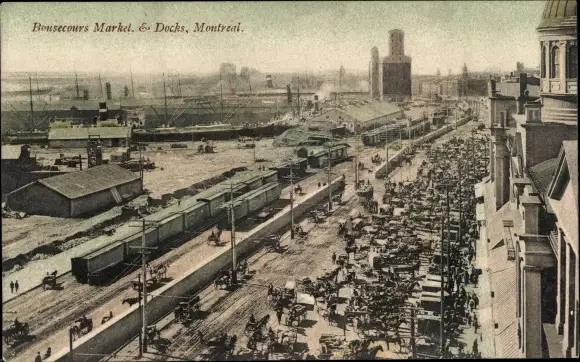 Ak Montreal Québec Kanada, Bonsecours Market and Docks, Hafenanlagen, Güterzüge
