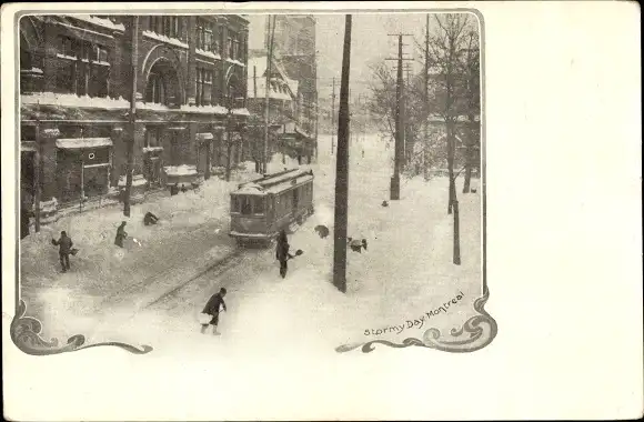 Ak Montreal Québec Kanada, Straßenpartie im Winter, Straßenbahn