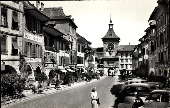 Ak Morat Murten Kanton Freiburg, Straßenpartie, Tor, Hotel