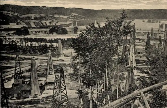 Ak Moreni Rumänien, Panorama der Petroleumfelder, Ölbohrtürme