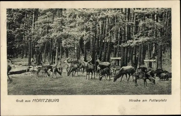 Ak Moritzburg in Sachsen, Hirsche am Futterplatz