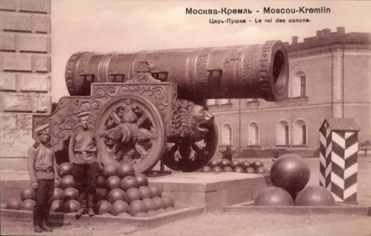 Ak Moskau Russland, Zar-Puska, zwei Soldaten, große Kanone, Kanonenkugeln, Moskauer Kreml