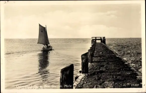Ak Mrzeżyno Deep Pommern, Mole, Segelboot in Fahrt, Meerespanorama