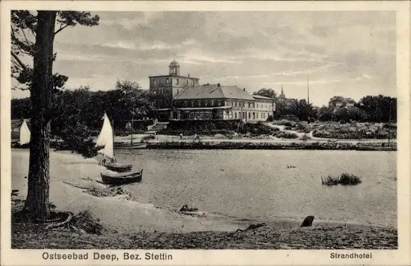 Ak Mrzeżyno Ostseebad Deep Pommern, Strandhotel, segelnde Boote, ruhige Landschaft