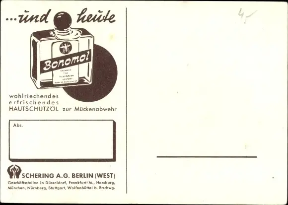 Ak Mückenabwehr anno dazumal, Reklame, Bonomol Hautschutzöl