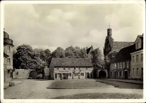 Ak Mühlberg an der Elbe, Altstädter Markt, Klosterkirche und Abteigiebel, Geschäft Hermann Köhler