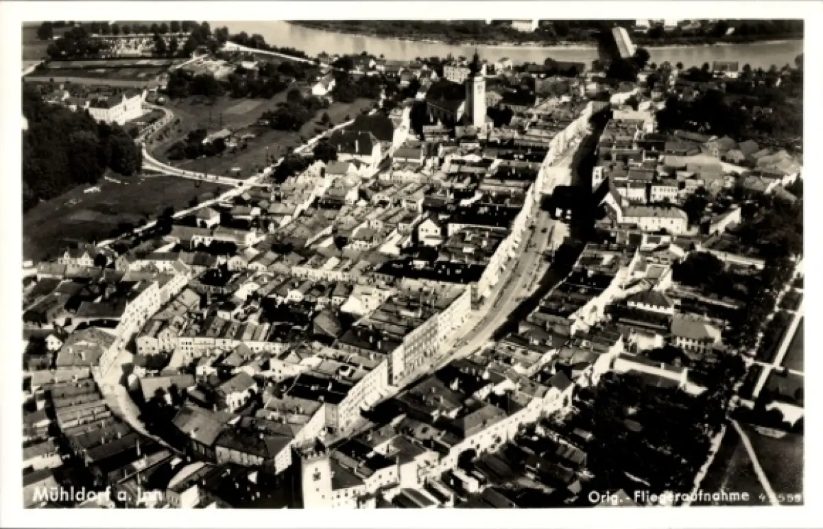 Ak Mühldorf am Inn Oberbayern, Luftaufnahme von Stadtansicht, Fluss im Hintergrund