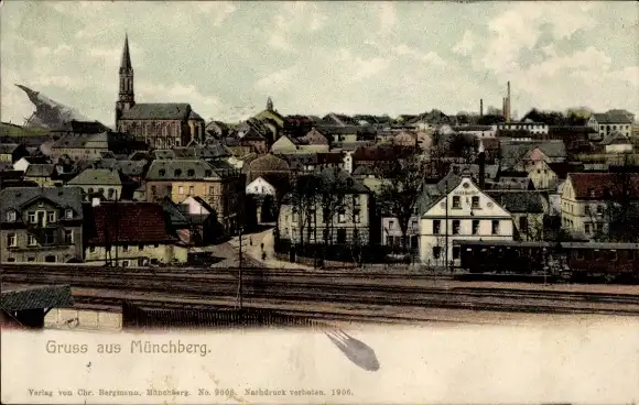 Ak Münchberg in Oberfranken Bayern, Blick über die Bahnstrecke auf den Ort und die Kirche