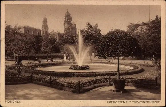 Ak München Bayern, Hofgarten mit Theatinerkirche, Springbrunnen