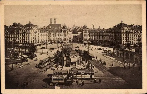 Ak München Bayern, Karlsplatz, Doppeldeckerbus, Straßenbahnen, Reklame Nivea
