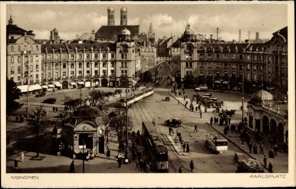 Ak München Bayern, Karlsplatz, Straßenbahn, Straßenszene