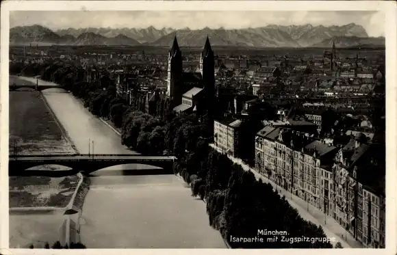 Ak München Bayern, Teilansicht, Isar, Brücke, Kirche, Zugspitzgruppe