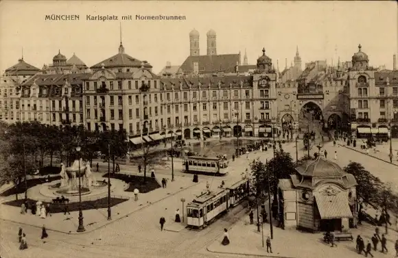 Ak München, Karlsplatz, Nornenbrunnen, Straßenbahn