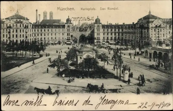 Ak München, Karlsplatz, das Rondel, Kutschen