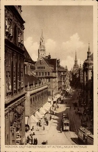 Ak München, Kaufingerstraße, Altes u. Neues Rathaus, Straßenbahn
