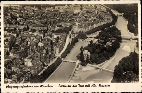 Ak München, Partie an der Isar, Alpines Museum, Fliegeraufnahme
