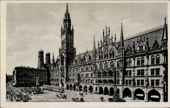 Ak München, Rathaus mit Frauenkirche, Straßenbahnen