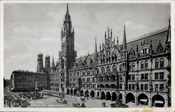 Ak München, Rathaus mit Frauenkirche, Straßenbahnen