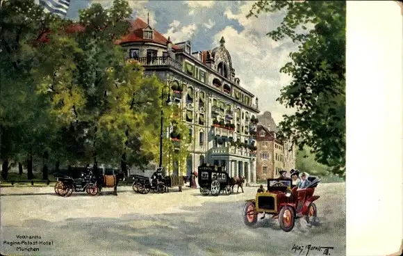 Ak München, Regina-Palast-Hotel, Straßenansicht, alte Autos, Bäume