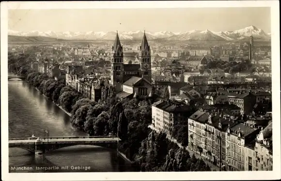 Ak München, Teilansicht, Isar, Alpen